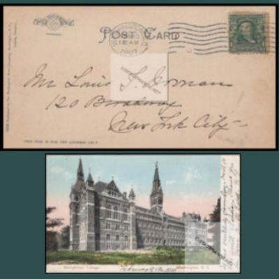 Sent to Louis Inman at 120 Broadway in New York City, it features an inquiry about the building depicted on the front of the card, with the writer wondering if Georgetown College, located in Washington, D.C., looked familiar.