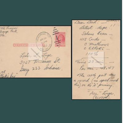 A fantastic and humorous postcard from Mr. Lester L. Luga's college son, who has a great sense of humor. The postal card is addressed to Lester L. Luga, 3728 Tennessee St., Gary, IN 222. The bottom-left section is labeled 'Clerk's Box.'