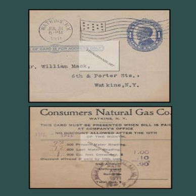 July 1911 gas bill, postmarked July 31, 1911, to Mr. William Mack, 6th & Porter Streets, Watkins, N.Y., from the Consumers Natural Gas Co. located in Watkins, N.Y.