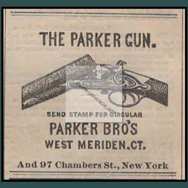 In the year 1878, a captivating business advertisement prominently showcased The Parker Gun, an exquisite firearm known for its craftsmanship and precision.