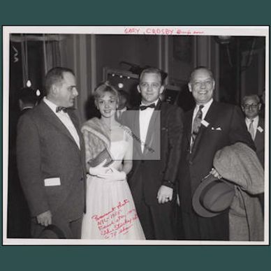 This captivating photograph from 1955 features Gary Crosby, son of the legendary entertainer Bing Crosby, alongside guests at the iconic Paramount Theatre in New York City.