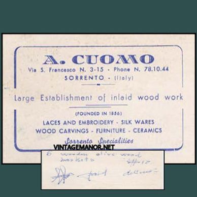 The back of the business card is signed, indicating a price of $12 for six wooden olive wood baskets, delivered.