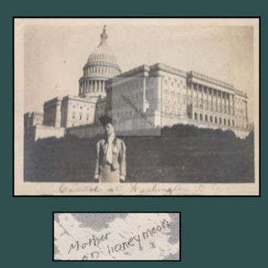 This vintage photograph depicts a woman posing during her honeymoon at the Capitol in Washington, D.C., a significant landmark and symbol of American democracy.