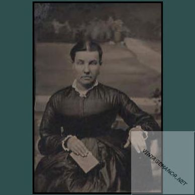 The woman in the photograph, her gaze distant and contemplative, radiates a deep sense of melancholy. She holds a book in her hands, and her flowing dress and authentic hairstyle reflect the fashion of her era, adding an intriguing touch to the scene.