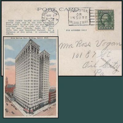 The postcard, featuring the Dime Savings Bank Building in Detroit, Michigan, is postmarked and stamped with the significant date of May 1923.